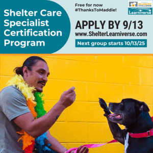 The UC Davis Koret Shelter Medicine Shelter Learniverse Presents: Join frontline teams nationwide and gain a professional title that represents your knowledge, compassion, and commitment to animal health and well-being. Our Shelter Care Specialist Certification Program is free for now, #ThanksToMaddie! Apply by December 5 to be considered for the Winter 2026 session that starts January 5.