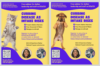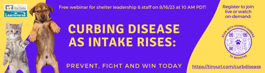 Free webinar for shelter leadership and staff on 8/16/23. Curbing Disease as Intake Rises: Prevent, Fight and Win today. Click on this image or use the registration link in the text below to join live or to access the webinar on-demand.