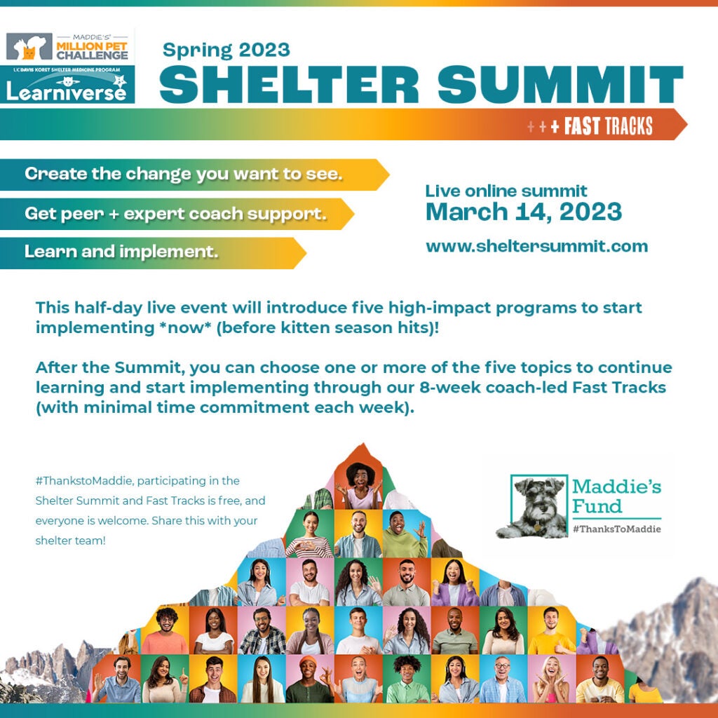 This new, different, and better learning experience is designed with your feedback, your busy schedules, and your big goals in mind. Best of all, #ThanksToMaddie, participation in the Shelter Summit and Fast Tracks is absolutely free and everyone is welcome. Share this with your team!
