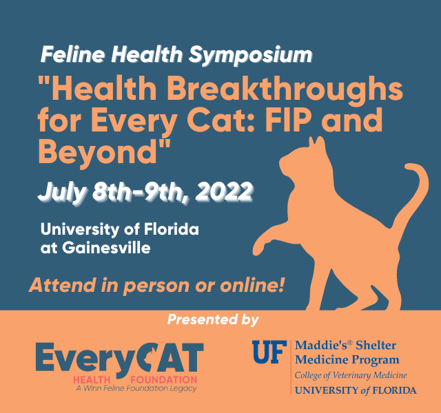 EveryCat Health Foundation, in collaboration with Maddie’s Shelter Medicine Program at the University of Florida College of Veterinary Medicine, will present “Health Breakthroughs for Every Cat: FIP and Beyond”, a feline health symposium, on Friday, July 8th, and Saturday, July 9th, 2022 at the University of Florida, Gainesville.