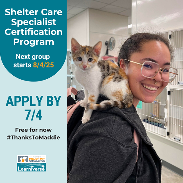 Are you ready to take your career in animal sheltering to the next level? Offered by the Koret Shelter Medicine Program Shelter Learniverse as part of Maddie’s® Million Pet Challenge, the Shelter Care Specialist Certification Program empowers frontline animal shelter workers to provide exceptional care, grounded in best practices, with a focus on improving outcomes for animals and communities.