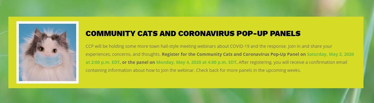 Our next Community Cats Podcast COVID-19 Pop-Up Panels will cover the following topics: