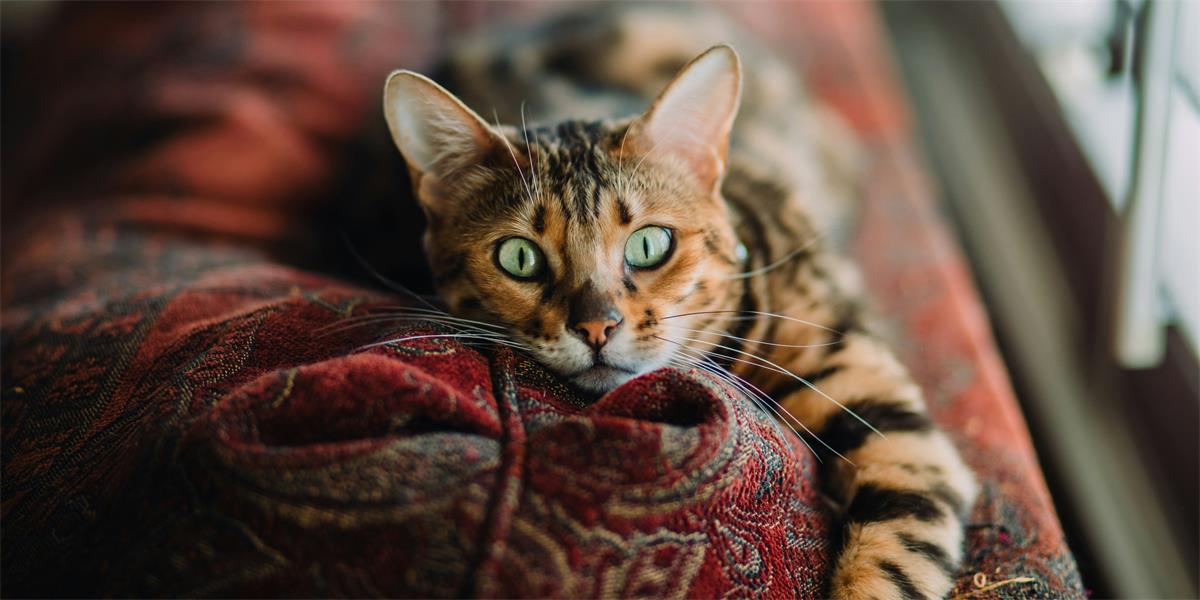 Cat lies across the top of a burgundy couch